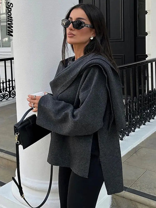 Knit Ruched-shoulder Long-sleeve Side-split Long-sleeve Dress