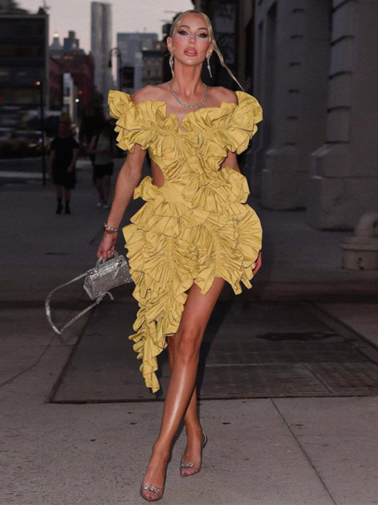 Ruffle 3D Flower-bud One-shoulder Short Dress