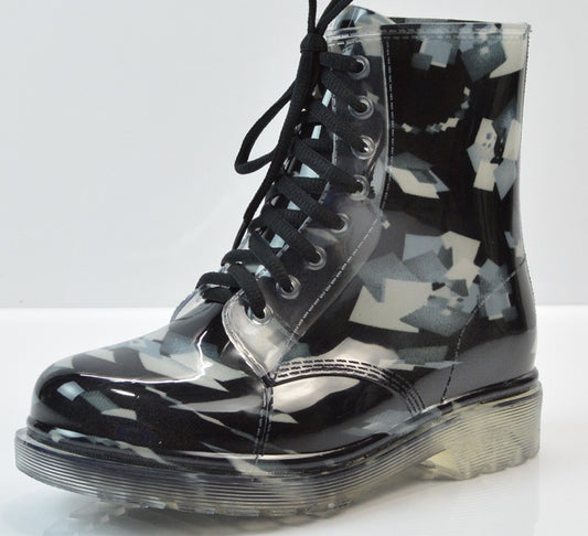 PVC Print Lace-up Flat Heel Ankle Rain Boots