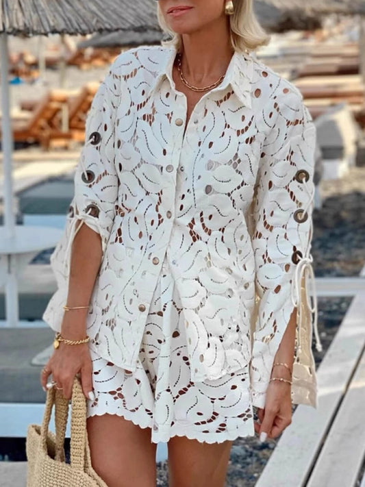 Lace Hollow Long-sleeved Shirt + Shorts Two-piece Set
