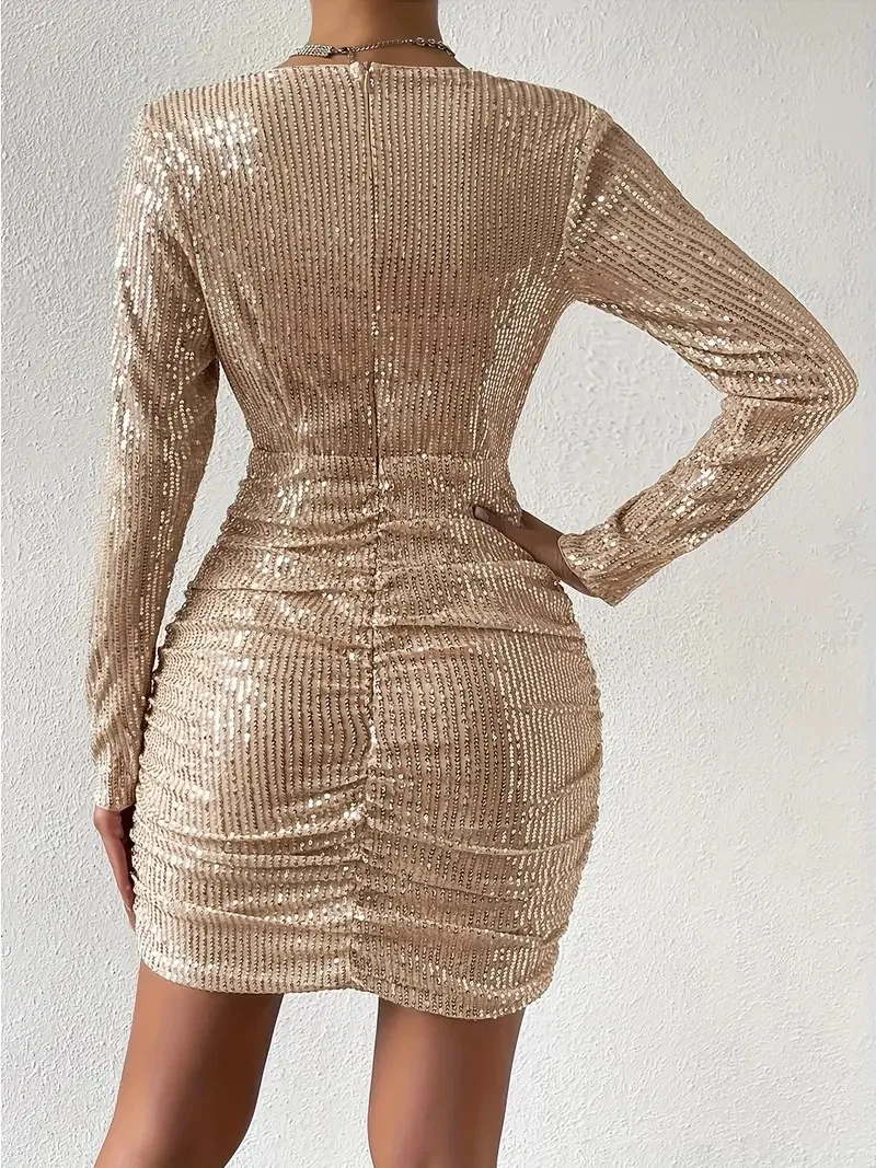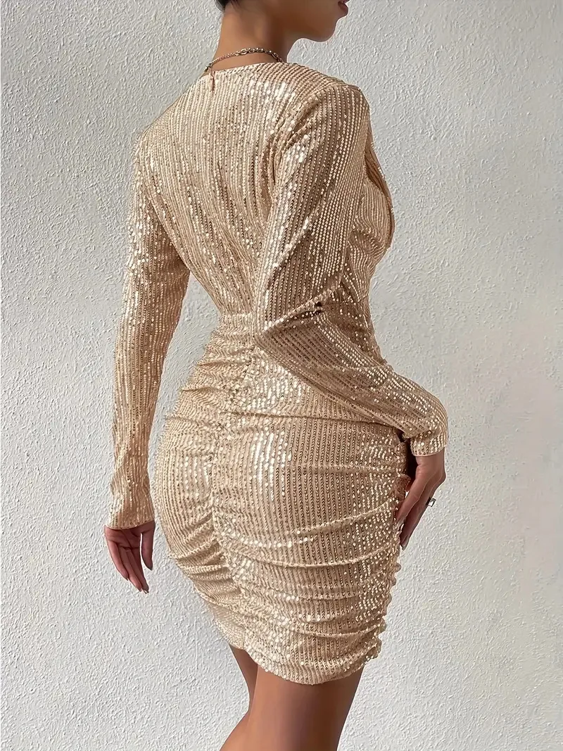 This stunning Sequin Pleated V-neck Long Sleeve Dress effortlessly combines elegance and comfort. The flowy design and silky soft fabric will make you feel like the belle of the ball. Perfect for special occasions or a night out, this dress will make you look and feel your best.