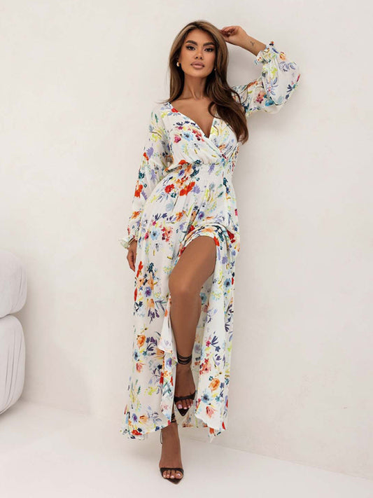 Flower Print V-Neck Side-Slit Long Sleeve Maxi Dress