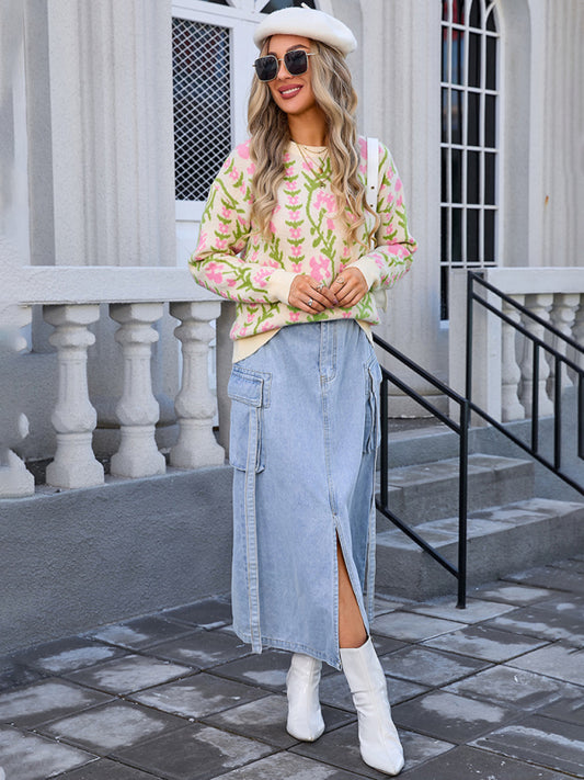 Knit Pearl Beading Long Sleeve Pencil Dress