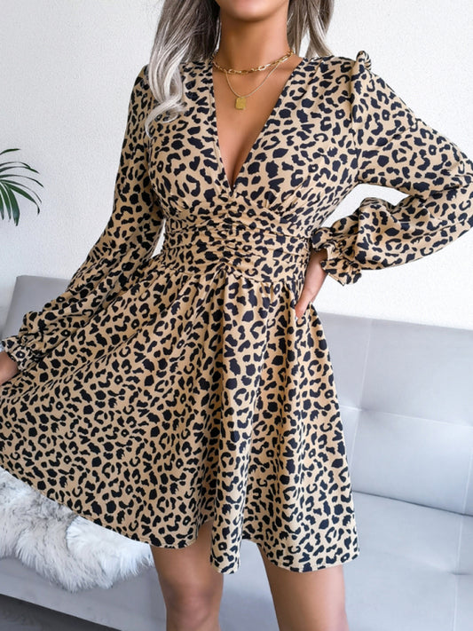 Leopard Print V-neck Pleated Waist Long Sleeve Dress