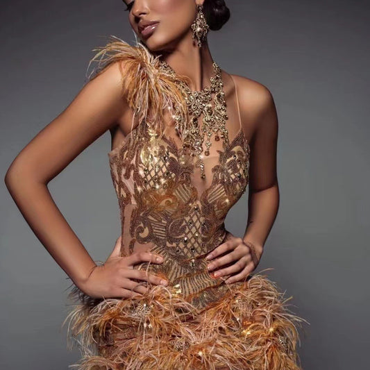 One Shoulder Halter-neck Sequin Beaded Tassel Long Sleeve Side-Spilt Maxi Dress