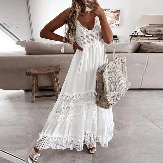 Lace V-neck Hollow Bowknot Long Sleeve Dress