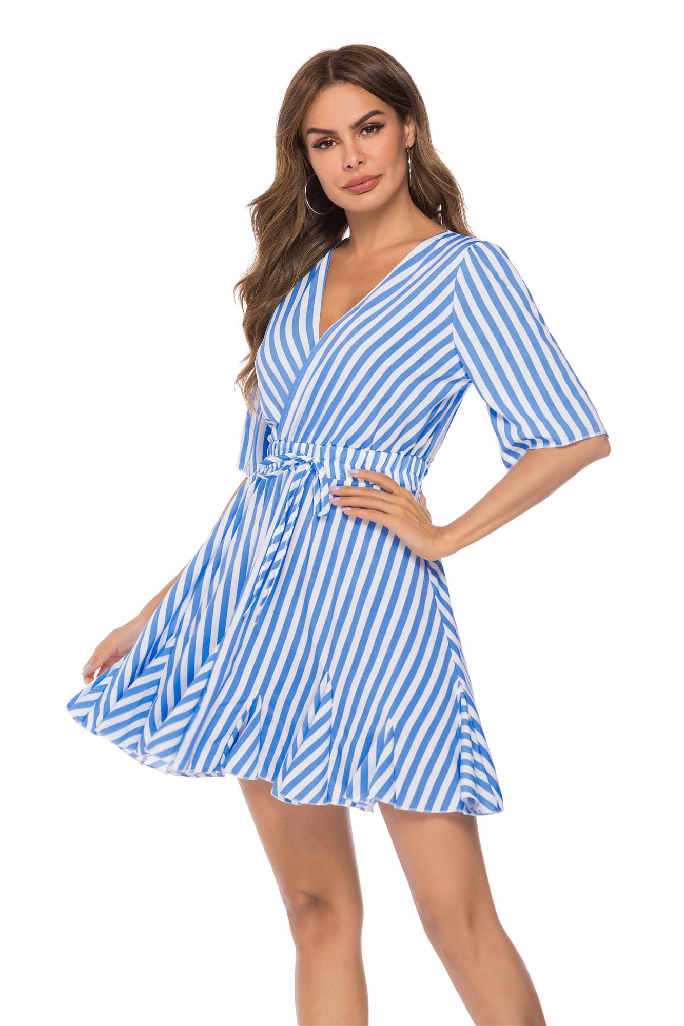 This stunning dress features a playful stripe pattern and a flattering ruffle design. With a belted waist and short sleeves, it's the perfect choice for any occasion. Embrace your inner fashionista with this must-have piece!